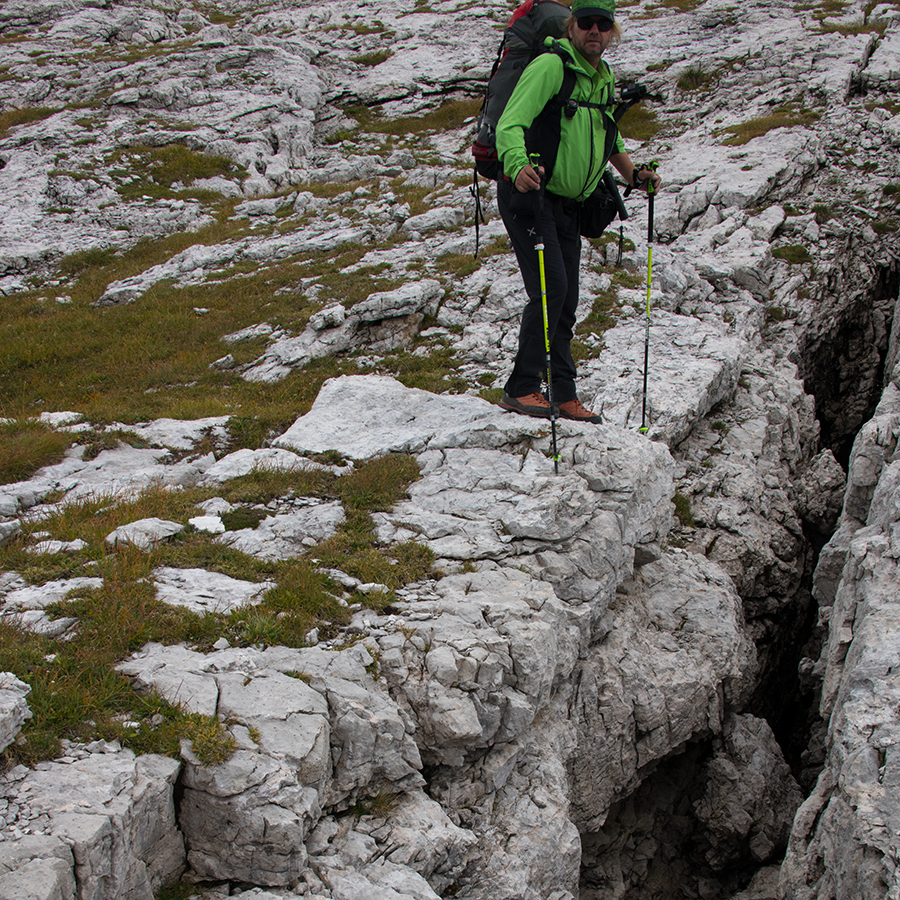 Was für eine grandiose Landschaft! Der Nieselregen und der Nebel um uns herum kann unsere Faszination nicht beeinträchtigen: die Brenta ist großes Kino! Viele Gebirge dieser Welt haben wir schon gesehen, aber diese Landschaft hier läßt einen vermuten, daß der liebe Gott mit großen, mit sehr großen „Bauklötzchen“ gespielt hat und dabei großen Spaß hatte. Eine wilde, rauhe Landschaft ist entstanden, in der wir in den nächsten Tagen mit Davide unterwegs sein werden!
