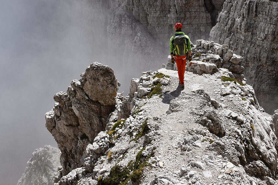 Man kann nur mit dem Kopf schütteln über so manche Möchtegern-Bergsteiger um uns herum, die erst in der Hütte erfragen, ob man beim Aufstieg zum Bocchette Alte Centrali wohl Steigeisen braucht. Ja, wenn man über einen Gletscher geht, macht das Sinn, Leute! Aber das Panorama entschädigt uns – falls wir gedacht hatten, daß das bisher schon großartig war: es geht noch mehr! Das ist sicher einer der tollsten Klettersteige und Aussichten, die wir je gesehen haben. Über den Gletscher hinauf, entlang von langen ausgesetzten Passagen, und dann: der Campanile Basso taucht aus dem Nebel auf! Die nicht ganz einfachen Teile dazwischen, die weiß Gott nicht alle seilversichert sind, und den steilen Zwischenabstieg haben wir am Ende schnell vergessen und sind uns einig: dieses Fleckchen Erde gehört mit zum Schönsten, was die Welt bietet!