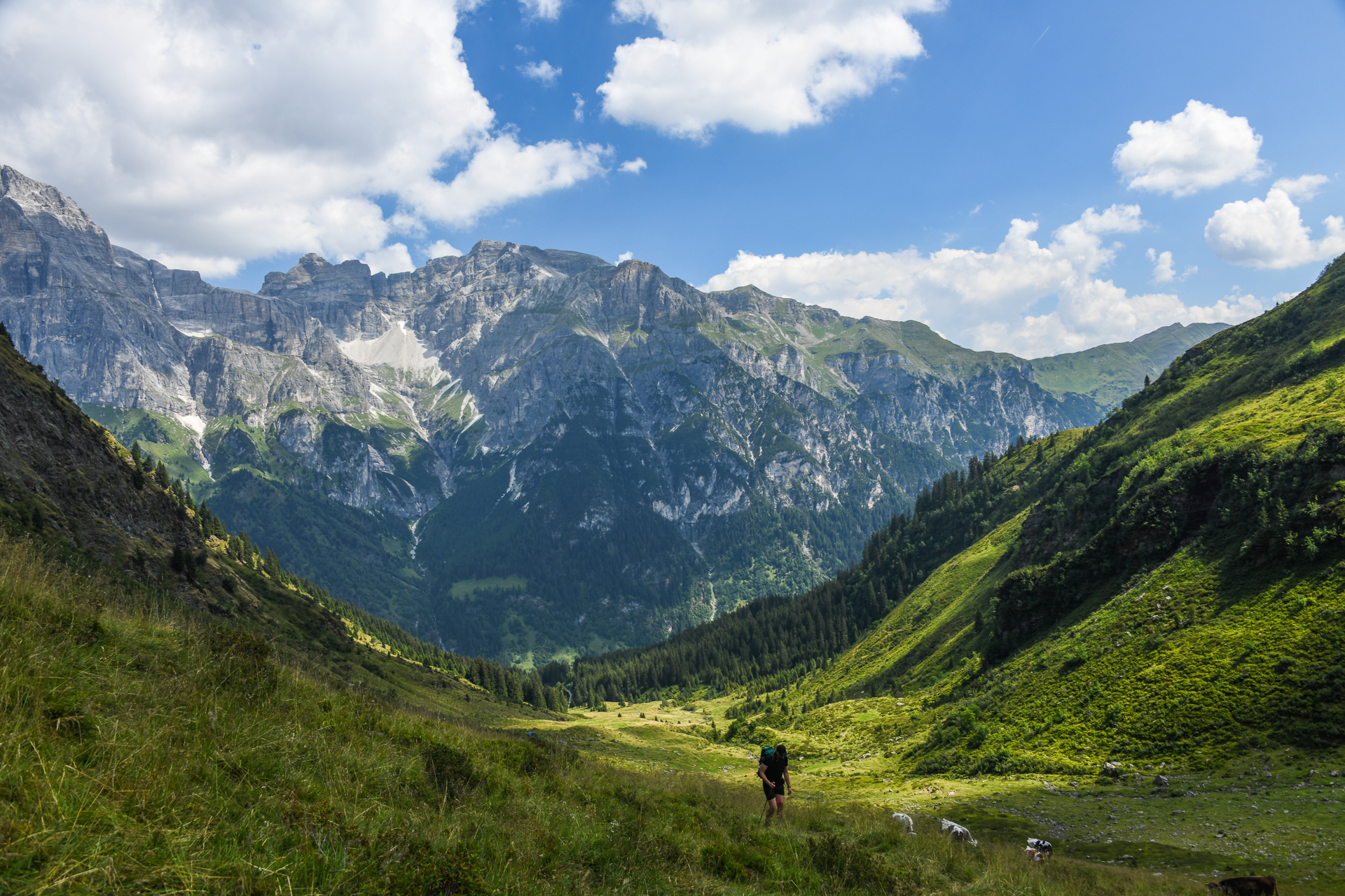 Nach dem langen Abstieg vom Mittenwalder Klettersteig über die Brunnsteinhütte sind unsere Knochen doch etwas lädiert, als wir uns am nächsten Tag zur Hallerangeralm aufmachen. Wunderschön zieht sich der Weg durch die Karwendeltäler entlang, und wir laufen an Kühen und saftigen Wiesen vorbei auf die Hallerangeralm - ein seit fast 200 Jahren familiengeführtes Haus, wo wir auf gemütliche Hüttenatmosphäre treffen. Das kleine Kirchlein neben der Alm schützt sicher auch die Kletterer, die sich an den Felsenwänden und rings herum probieren.