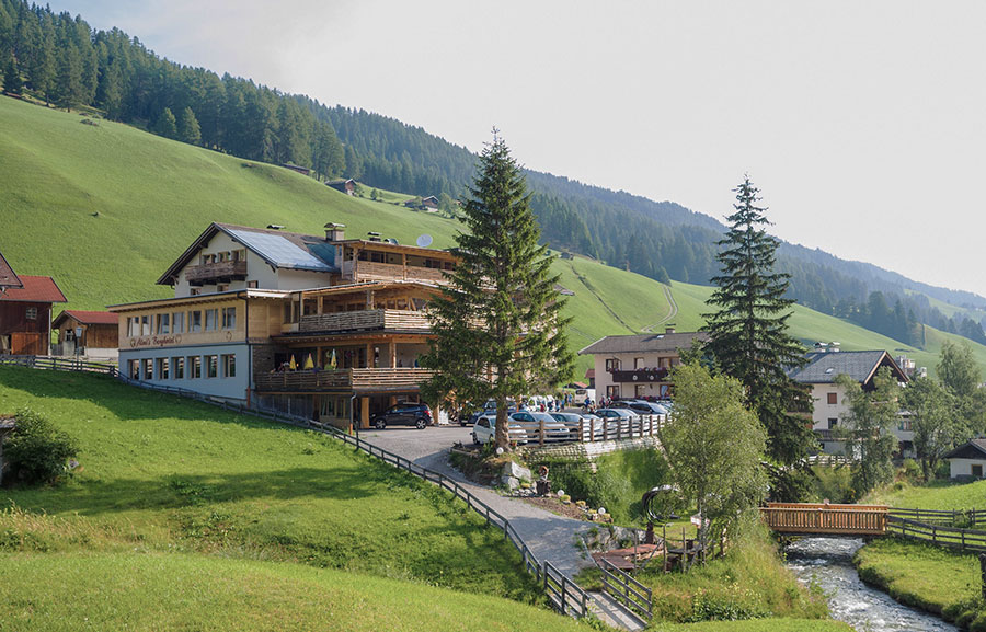Ein uralter Gasthof, der 1184 zum ersten Mal urkundlich in einer päpstlichen Schrift erwähnt ist und jetzt in dritter Generation betrieben wird. In den letzten Jahren wurde das Hotel wieder komplett rückgebaut, und dabei wurden geschickt die alten Mauern integriert. Ursprünglich ein Hospiz für Pilger (Hospize im damaligen Sinne waren eher begrifflich zu verstehen als Herberge und so ist es über die Jahrhunderte eigentlich immer eine Herberge gewesen), wunderschön mit der kleinen Wallfahrtskirche neben dran gelegen. Hier wird sehr sehr viel mit Kräutern produziert. Umgeben von Lärchen ist der Ort auch bekannt für seinen Löwenzahn im Frühjahr und Radicchio im Herbst, das wird also hier auf die Speisekarte eingebaut. Weg von dem Luxus, zurück in die Ruhe für die Pilger und für Leute, die die Alpen nicht nur als Funpark erleben wollen.